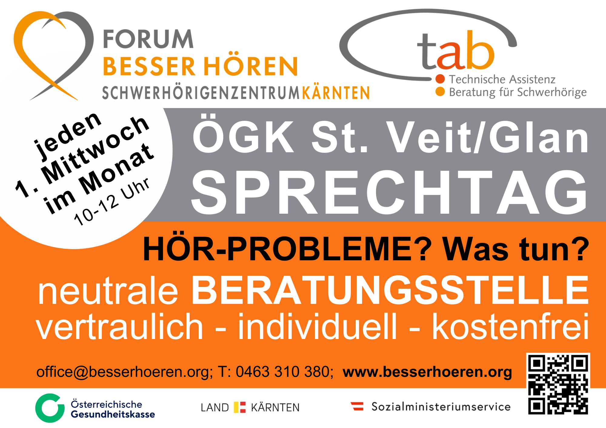 Jeden 1. Mittwoch im Monat findet in der Zeit von 10.00 bis 12.00 Uhr ein Sprechtag in der ÖGK St. Veit an der Glan statt.