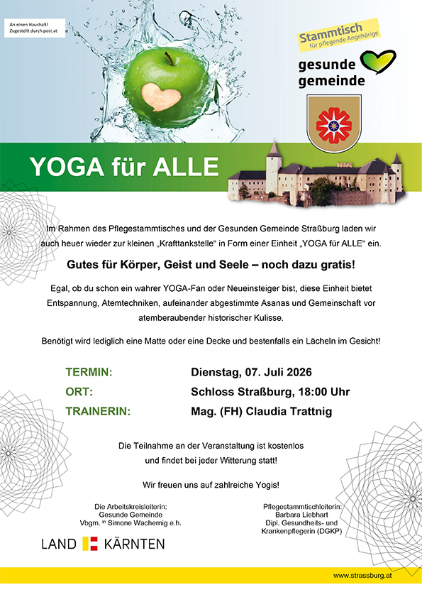 Im Rahmen des Pflegestammtisches und der Gesunden Gemeinde Straßburg laden wir auch heuer wieder zur kleinen „Krafttankstelle“ in Form einer Einheit „YOGA für ALLE“ mit Trainerin Mag. (FH) Claudia Trattnig ein.