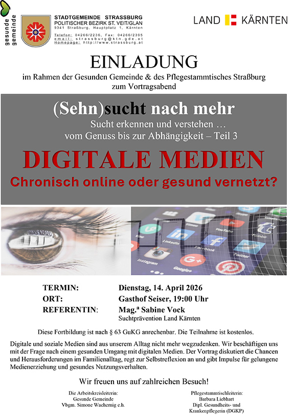 Einladung Gesunde Gemeinde & Pflegestammtisch zum Vortrag Suchtprävention Teil 3 - Umgang mit digitalen Medien