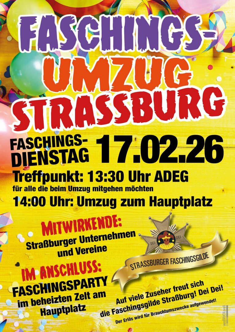 Auch heuer findet wieder ein Faschingsumzug am Faschingdienstag in Straßburg statt. Der Umzug 2024 war eine tolle Veranstaltung und auch 2026 hoffen wir auf viele Teilnehmer und Teilnehmerinnen.
